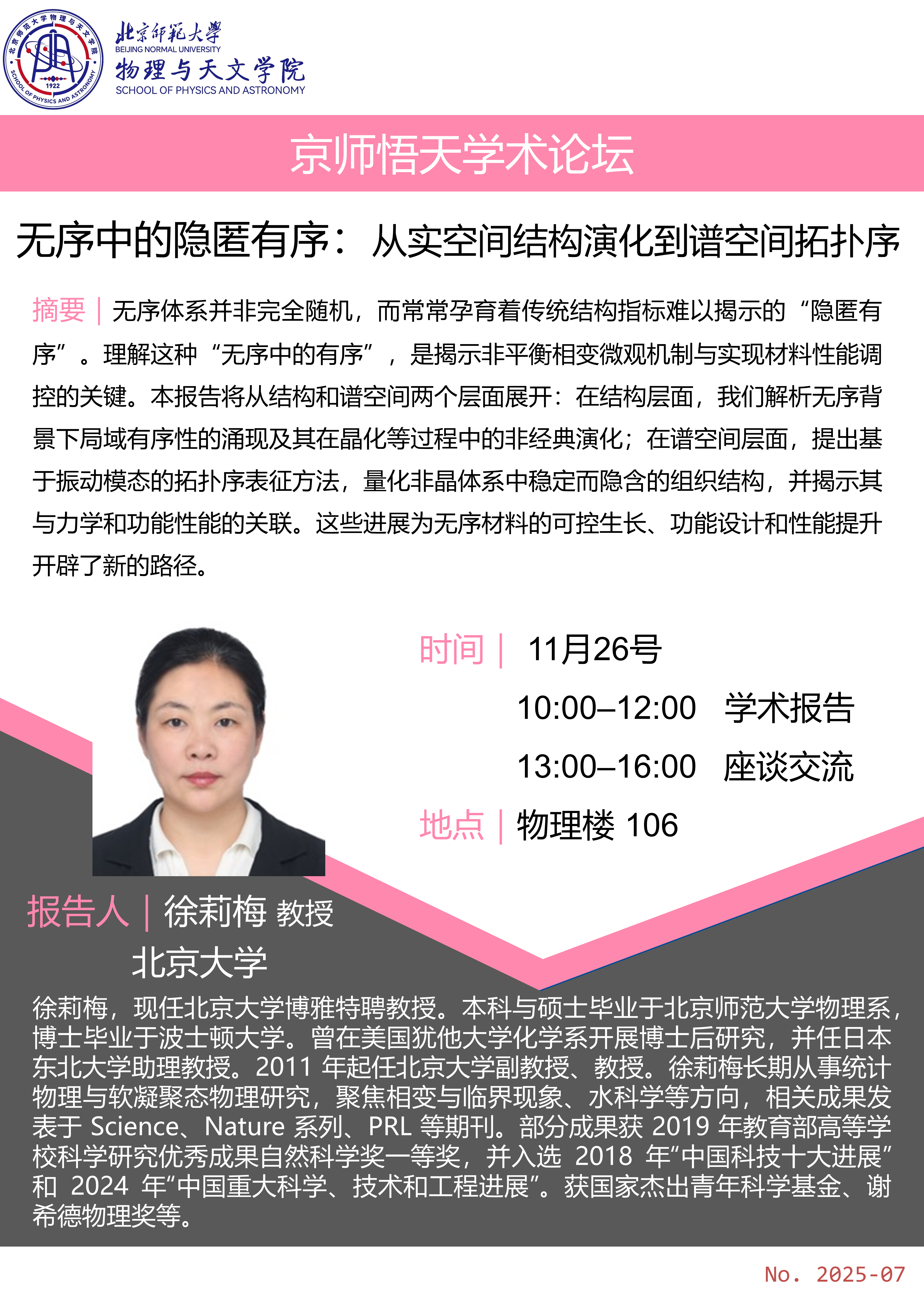 摘要:无序体系并非完全随机,而常常孕育着传统结构指标难以揭示的“隐匿有序”。理解这种“无序中的有序”,是揭示非平衡相变微观机制与实现材料性能调控的关键。本报告将从结构和谱空间两个层面展开:在结构层面,我们解...