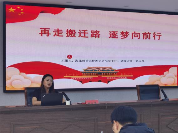 7月17日上午,海北州委党校理论研究室主任、高级讲师姚永琴老师为培训班学员开展了《再走搬迁路 逐梦向前行》主题教学,教学从历史抉择-选址金银滩、故土难离-金银滩牧民搬迁的历史回顾、精神体现-牧民搬迁的价值意义、再铸辉煌-新时代的金银滩草原四个方面展开。姚老师用生动的事例和精准的数字,为我们呈现了在那个特殊的时代背景下,牧民们积极响应政府号召,抛家舍业支持国家“两弹一星”建设的宏伟画卷,从另一个角度进一步诠释了何为“两弹一星”精神、何为爱国主义精神。