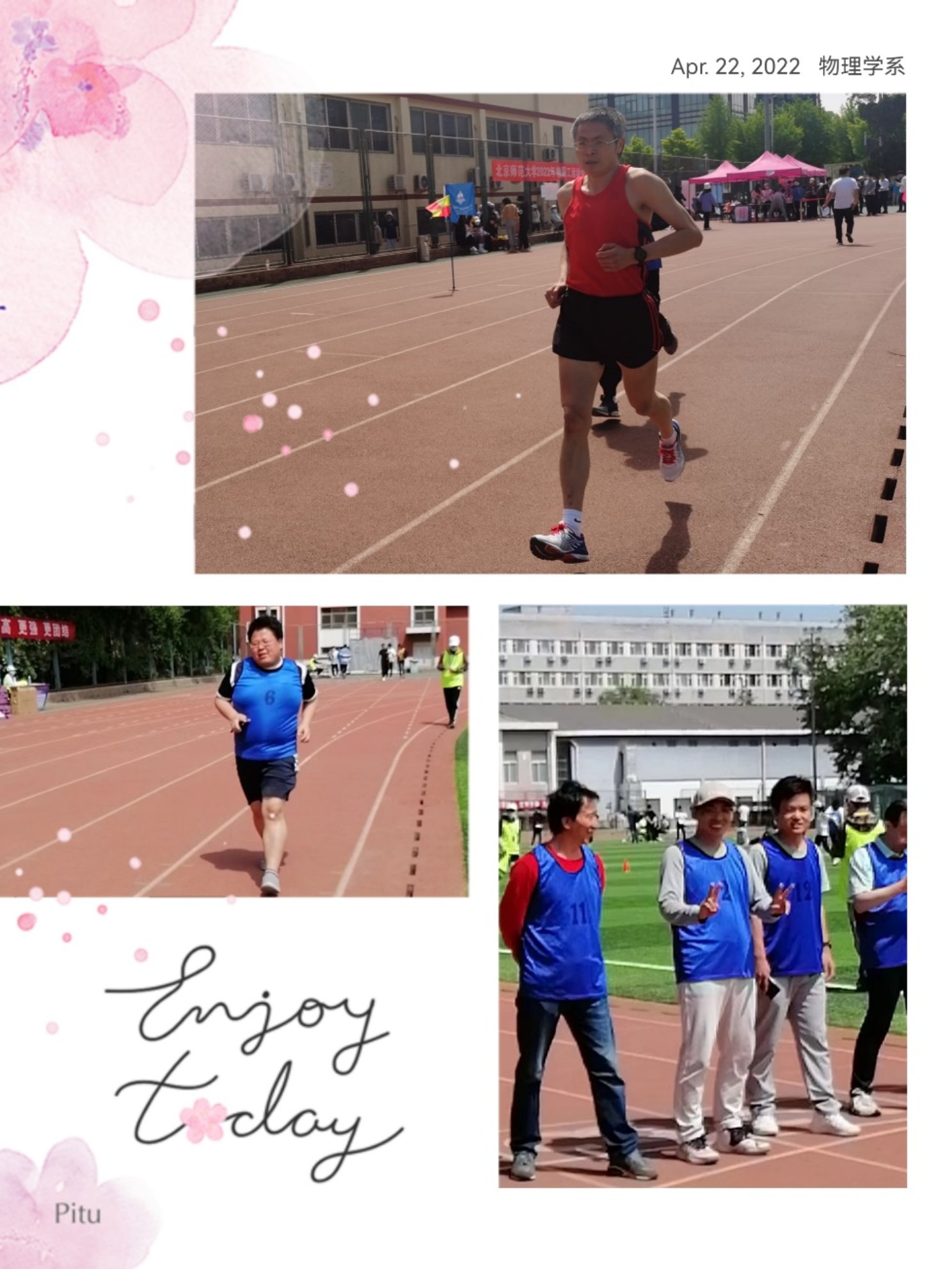 2022年4月22日一大早,物理学系的师生就来到操场,斗志昂扬的参加了运动会开幕式。老师们身着统一的浅蓝色卫衣,精神抖擞,步伐矫健,仿佛一下子回到了学生时代。长跑项目是教职工运动会含金量最高的项目,男生的1200米和女生的800米,对于选手的速度和耐力都是一个不小考验。即便如此,老师们参赛仍然十分踊跃。看,选手们在起跑线上蓄势待发,跃跃欲试。长跑健将马天星稳居第一,当仁不让,其他的老师们也是奋力追赶,不甘落后。