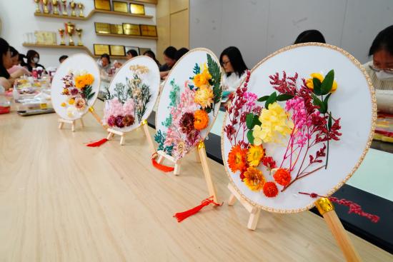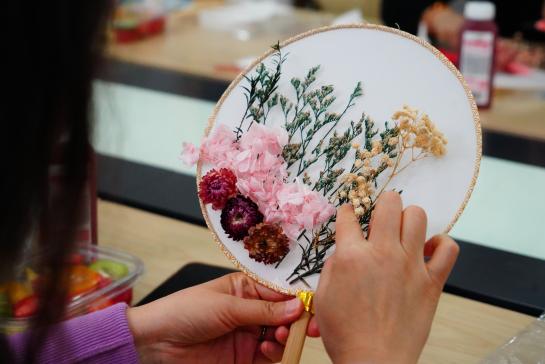 在这专属的时光里,女教职工们开启了一场“以扇为纸,以花为笔”的创作之旅。从挑选永生玫瑰、绣球、苔藓等天然花材,到构思布局、修剪黏贴,大家全情投入,指尖轻捻间,素白的团扇逐渐被赋予鲜活的生命力——有的以淡雅粉紫为主调,勾勒出江南烟雨的婉约;有的用金黄与深红层叠,渲染出秋日枫林的热烈;还有更有巧思者将自己独特的审美融入花艺,让心灵之美与扇面对话。