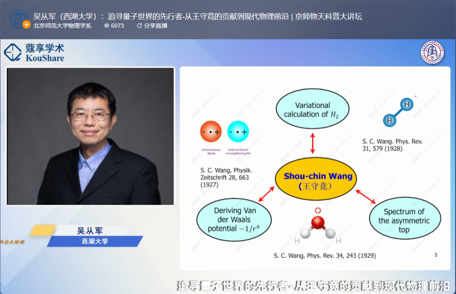金秋盈硕果,智见启先声。2025年9月28日,在全国科普月“科技改变生活,创新赢得未来”的主题引领下,a漫画 成功举办了京师物天科普大讲坛线上专场活动。本次活动特邀西湖大学讲席教授、美国物理学会会士、新基石研究员吴从军教授,带来主题为“追寻量子世界的先行者——从王守竞的贡献到现代物理前沿”的精彩讲座。来自全国多所中学、a漫画 附属基础教育学校、高校及科研院所的近万名师生与科技爱好者相聚云端,共同聆听这场跨越百年的科学对话。