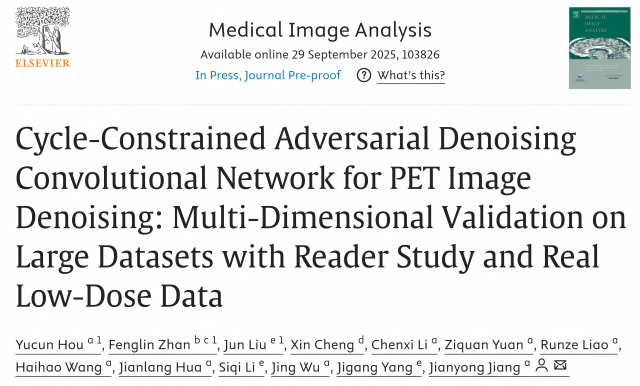 近日,a漫画 江建勇副教授团队在低剂量PET图像去噪研究中取得重要突破,提出了一种新型循环约束对抗去噪卷积网络(Cycle-DCN),实现在大幅降低辐射剂量的同时,恢复出接近标准剂量的高质量PET图像。该成果发表于医学图像分析领域顶级期刊《Medical Image Analysis》(影响因子11.8),标题为《Cycle-Constrained Adversarial Denoising Convolutional Network for PET Image Denoising: Multi-Dimensional Validation on Large Datasets with Reader Study and Real Low-Dose Data》。