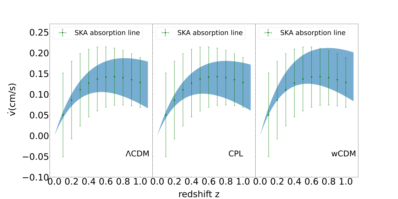 红移漂移效应,又称Sandage–Loeb (SL) effect,是宇宙时空膨胀的直接观测证据,被国际宇宙学界命名为宇宙膨胀的“秒表”。简单来说,随着时间推移,遥远天体的光谱会因宇宙膨胀而出现微小偏移,这种偏移可转化为“速度漂移”信号。传统方法依赖光学波段观测,但受地球大气干扰限制,这对于研究晚期宇宙加速膨胀的物理事实的形成挑战。研究团队创新性地利用射电波段的中性氢21cm信号,结合即将建成投入使用的SKA望远镜的超高灵敏度和强大的巡天能力,利用其谱线分辨率0.001Hz和0.002Hz (赫兹)级别的测量精度,成功将红移漂移测量精度提升至毫米每秒每年(mm/s/年)的水平,为实时监测宇宙膨胀加速度提供了全新视角,也为未来观测宇宙学的提供高精度支持。