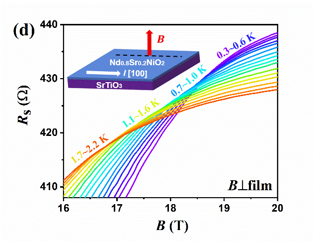 从发现铜氧化物高温超导现象至今,阐明高温超导电性的物理机制、寻找更高的Tc乃至室温量级的新超导体一直是科学家的奋斗目标。最近,在无限层镍氧化物中发现的与铜基超导相类似的非常规超导电性[1]激发起了人们新一轮的研究兴趣。作为一个迅速发展的领域,镍基超导在实验上还有很多亟待解决的科学问题,如112相母体中是否存在磁有序。虽然在块材核磁共振和薄膜共振非弹性X射线散射研究中,已经观察到112母相在有限温度下存在一定的磁激发和自旋涨落,但是目前无论是在薄膜还是块材形式的112相中都没有观测到与铜氧化物和铁基高温超导母体类似的长程反铁磁序的存在。最近,聂家财教授研究组报道在欠掺杂Nd1-xSrxNiO2超导薄膜中发现了近藤散射效应[2]。这表明,长程反铁磁序的缺失可能与Ni-3d轨道的自掺杂或近藤效应有关。另一方面,薄膜的不均匀性,如源自于镍基超导样品非原位生长的杂质和缺陷,也可能会破坏长程反铁磁序。此外,扫描透射电子显微镜实验还报道了在样品表面顶部形成的Ruddlesden-Popper型垂直结构缺陷。这种猝灭的无序效应可以显著改变超导体-金属转变(SMT)的临界行为,并产生量子格里菲斯奇异性(QGS)。然而,磁场诱导的QGS主要存在于传统超导体中[3],这种奇异的量子临界现象是否会存在于非常规超导体中仍有待探索。