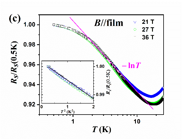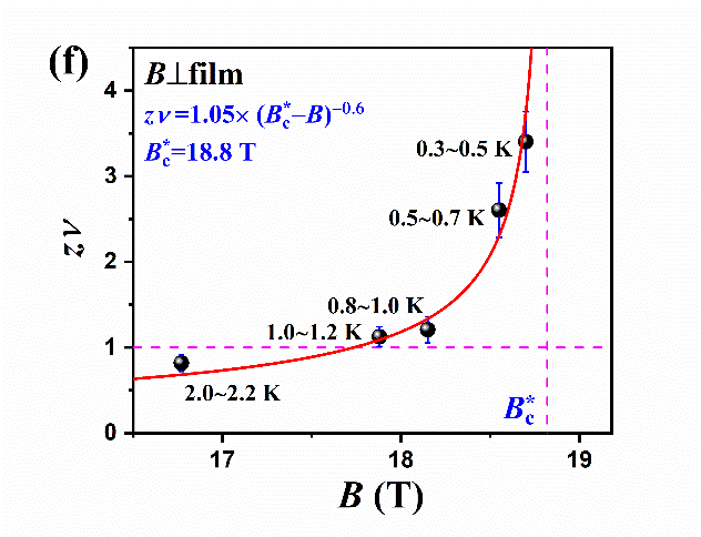 图1 | (a)面内磁场和(b)垂直磁场下的等磁Rs(T)曲线。插图是磁场范围为18-36T的低温下的放大图。红圈分别表示面内磁场和垂直磁场下极低温下19.5T和19.0T的Rs平台。(c)面内和(d)垂直磁场下极低温区的等温Rs(B)曲线。插图是磁场和电流方向的实验配置。(e)面内和(f)垂直磁场下,有限尺寸标度分析给出的临界指数zn。红色实线为基于激活标度定律的拟合曲线,水平的品红色虚线表示zn=1。