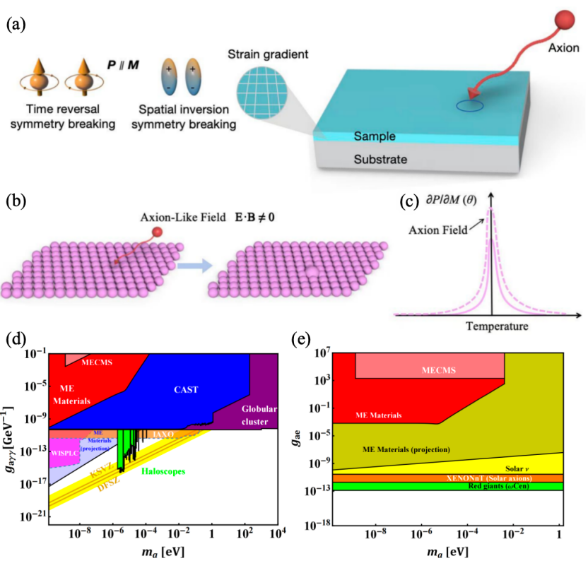 图1:(a)人工磁电材料中平行极化(P)与磁化(M),对应空间反演对称性与时间反演对称性的同时破缺;(b)外部轴子与材料内部类轴子场产生耦合;(c)轴子暗物质激发下,外部轴子与磁电材料内部的P•M模式耦合所调制的磁电响应;(d)基于现有实验结果对轴子-光子耦合常数gaγγ的限制;(e)基于现有实验结果对轴子-电子耦合常数gae的限制。