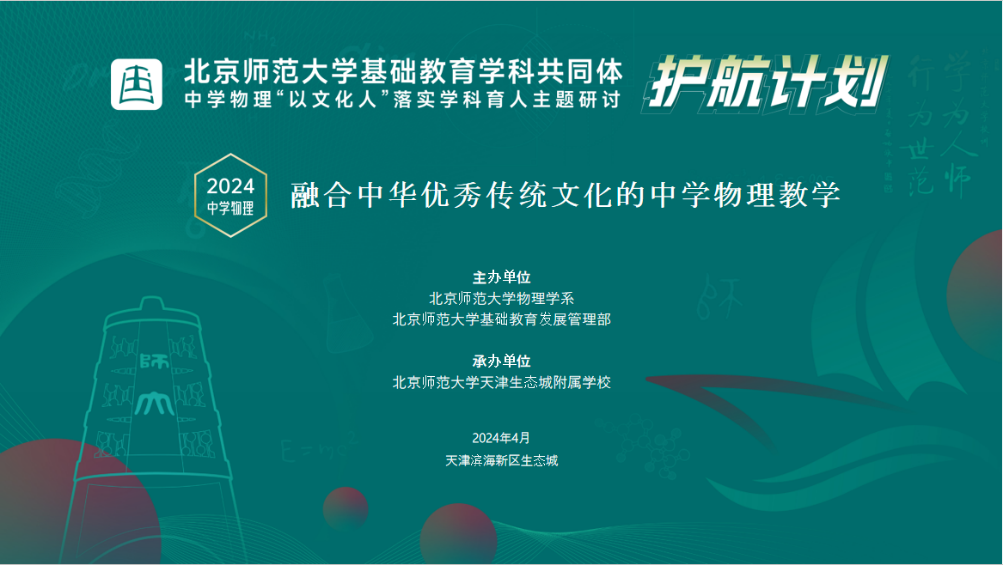 2024年4月26日至28日,由a漫画 物理学系与a漫画 基础教育发展管理部共同主办,a漫画 天津生态城附属学校承办,主题为“融合中华优秀传统文化的中学物理教学”的全国物理教师研讨活动成功举行。以a漫画 相关学校为主体的全国各地物理教师齐聚津门,共研在中学物理教育教学中如何传承中华优秀传统文化,如何增强学生文化自信,通过以文化人的方式落实为党育人、为国育才。