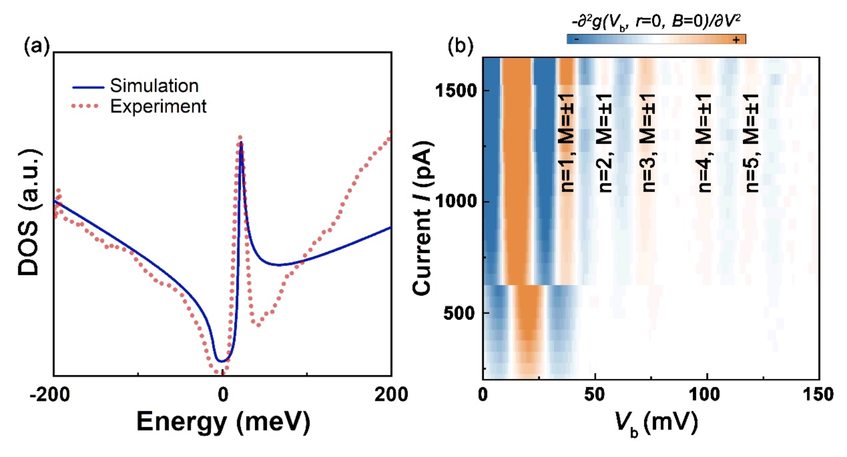 图2| (a) 双层石墨烯低能区态密度,尖峰为导带边平带贡献。 (b) 不同针尖距离下的隧穿电导的负二阶微分图,在针尖靠近样品时(隧穿电流较大),束缚态的特征更为明显。