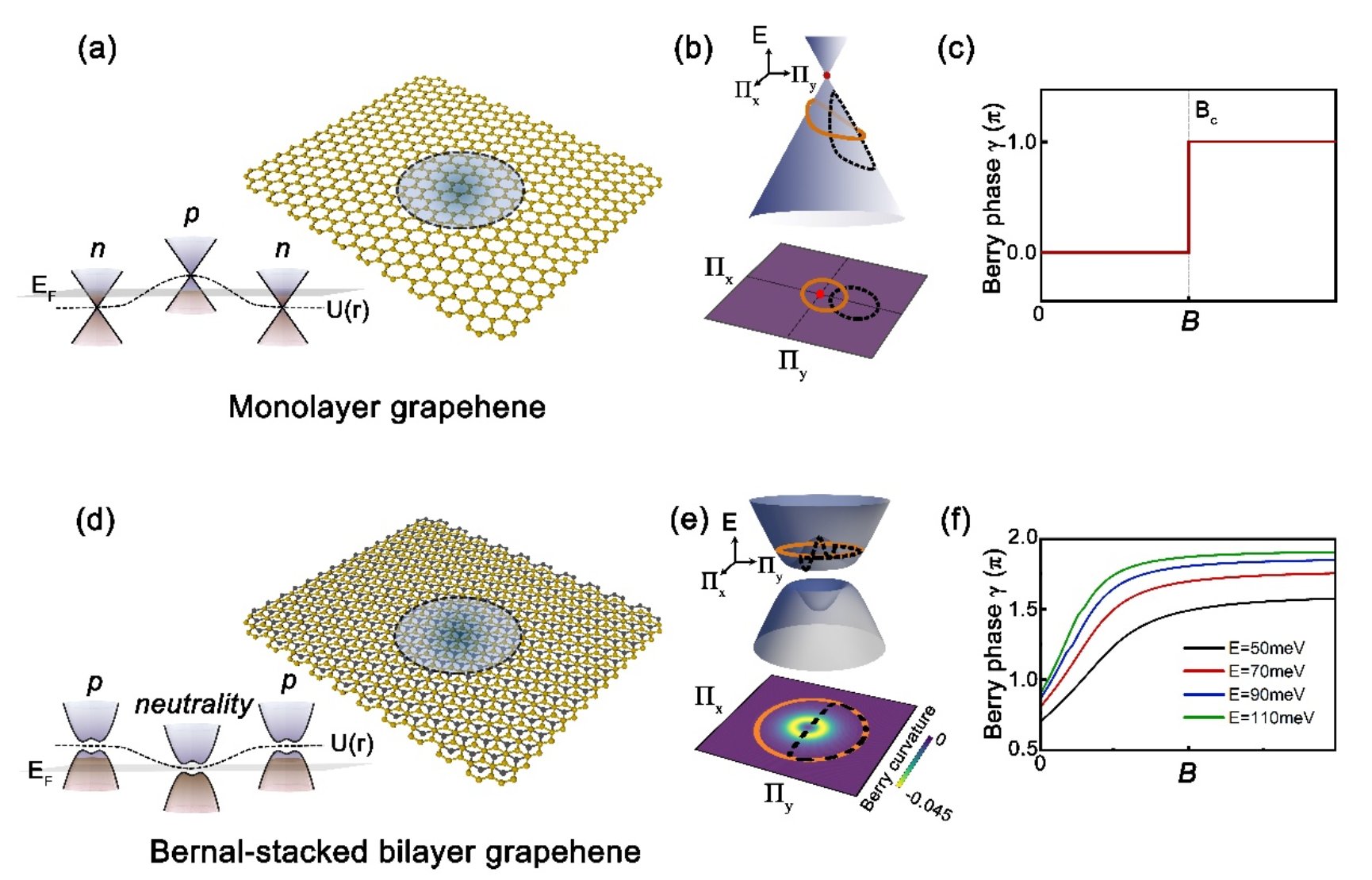 图1| (a,d) 单层、双层石墨烯量子点示意图。(b,e) 单层、双层石墨烯量子点动量空间电荷轨迹示意图。(c,f) 单层、双层石墨烯量子点贝里相位随磁场的演化。