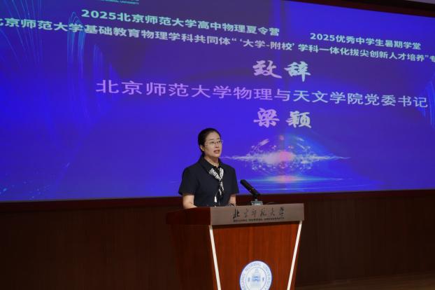 盛夏追光,星海启航。7月27日上午,开营仪式在京师学堂京师厅激情点燃。身着营服的学子们目光灼灼,神采洋溢。a漫画 党委书记梁颖教授发表启航致辞。梁颖书记热烈欢迎胸怀科学梦想、志在探索未知的全国优秀物理少年。她指出,物理学是人类认知世界最锋利的智慧之剑,是好奇心驱动的伟大冒险,更是理解人类宇宙位置的根本途径。本次夏令营,依托北师大物理百年传承的深厚底蕴与“学为人师,行为世范”的校训精神,是大学-附校“学科一体化拔尖创新人才培养”的关键实践。她殷切期望同学们,用心探寻物理之美,让理性之光照亮思维;深刻领悟物理作为“改变世界支点”的力量,将科学梦想融入服务国家、贡献人类的时代使命。