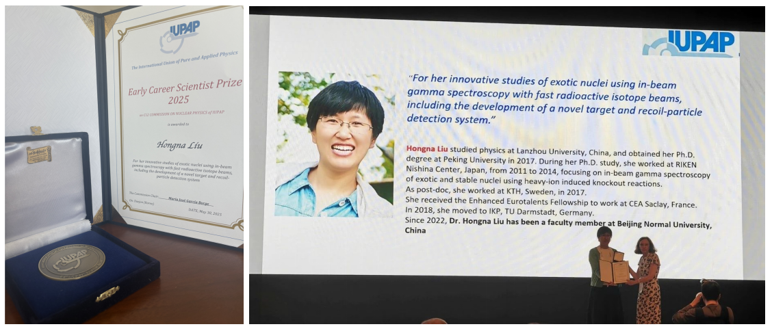 图1:刘红娜研究员获IUPAP 青年科学家奖,IUPAP-C12主席Maria Jose Garcia Borge为其颁奖。