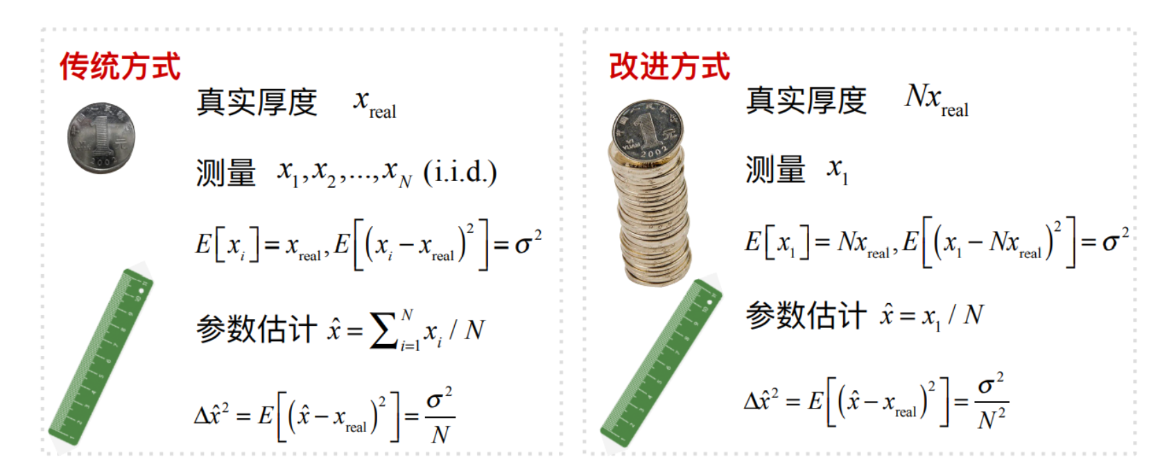 这里以测量硬币的厚度为例。传统的方式是每次测量一枚硬币的厚度,重复测量N次。假设测量值的期望等于硬币的真实厚度(即无偏估计),那么最终测量厚度的标准差将正比于