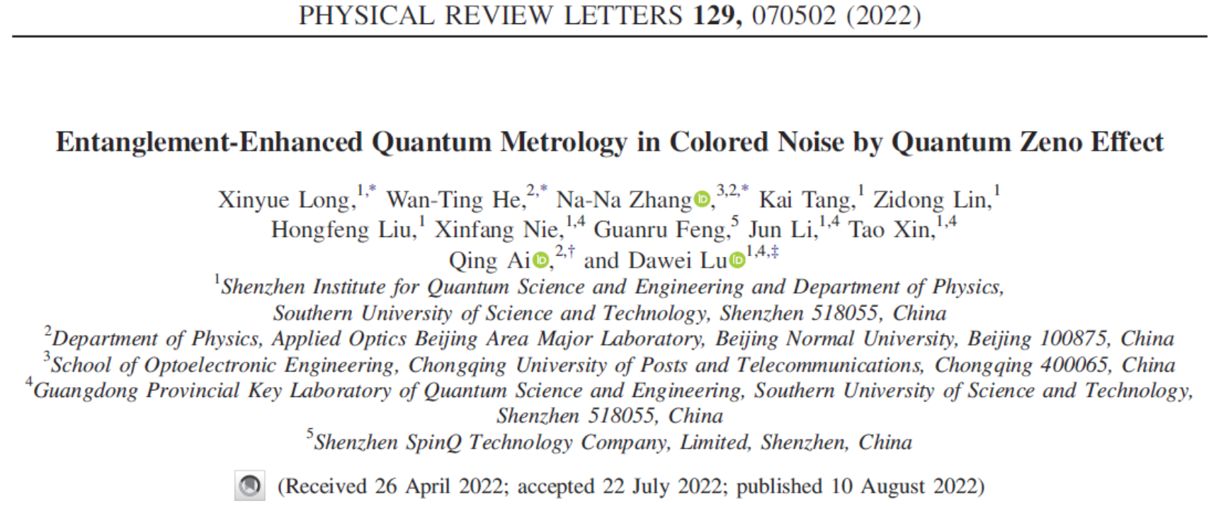 1. Entanglement-Enhanced Quantum Metrology in Colored Noise by Quantum Zeno Effect, X.-Y. Long, W.-T. He, N.-N. Zhang, K. Tang, Z.-D. Lin, H.-F. Liu, X.-F. Nie, G.-R. Feng, J. Li, T. Xin, Q. Ai, and D. W. Lu, Phys. Rev. Lett. 129, 070502 (2022)