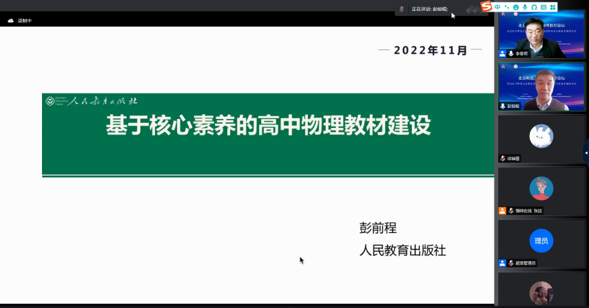 人教版教材主编、人民教育出版彭前程编审以《基于核心素养的高中物理教材建设》为题,引用了大量实例,从教材编写的角度,介绍了核心素养的理解、物理观念的建立、科学思维的培养、科学探究的设计、科学态度与责任的体现。