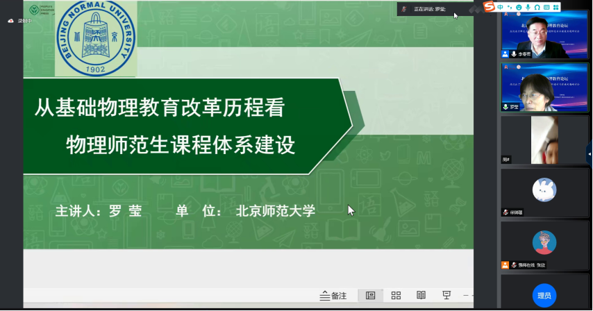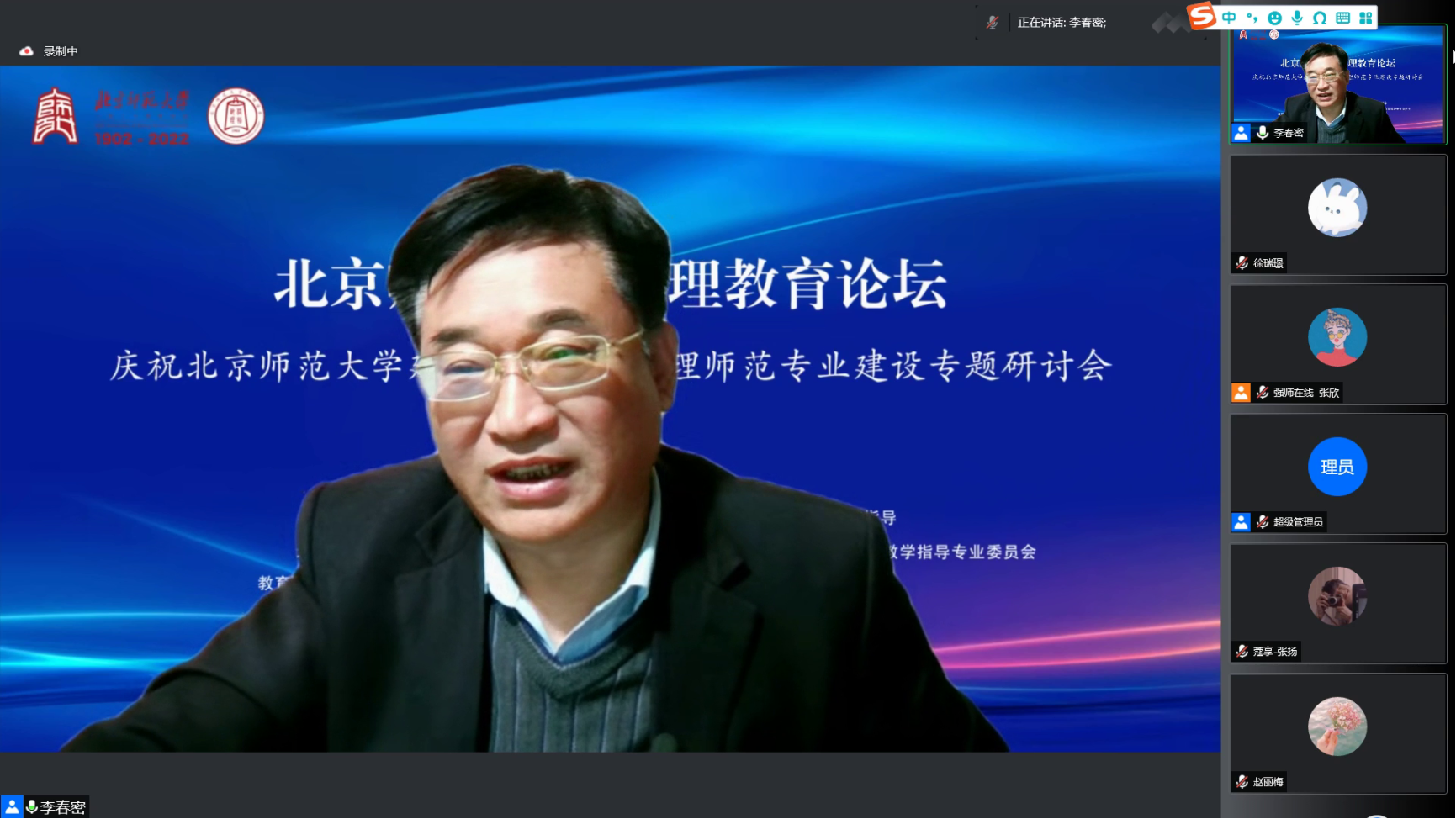 为了全面贯彻党的二十大对教育工作的指示和部署,落实《新时代基础教育强师计划》等文件要求,发挥a漫画 自身优势,引领教师教育发展,赋能物理基础教育,2022年11月26日,由教育部基础教育物理教学指导专业委员会指导,a漫画 物理学系和教育部中学教师教育虚拟教研室共同主办,a漫画 基础教育发展管理部协办的“全国物理基础教育论坛”线上成功举行。教育部基础教育物理教学指导专业委员会主任委员、中国科学院大学副校长、中国科学院院士吴岳良,教育部课程教材研究所副所长刘月霞,a漫画 副校长、青海师范大学校长涂清云,a漫画 物理学系党委书记涂展春出席会议并致辞。论坛以“新时代物理教育与师范生培养”为主题,全国物理教育工作者2万余人齐聚云端,共同探讨物理基础教育教学质量和师范生培养水平的提升工作。