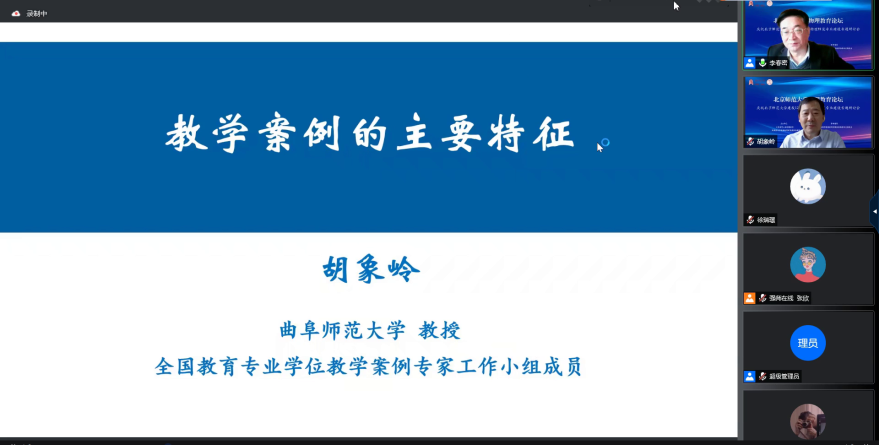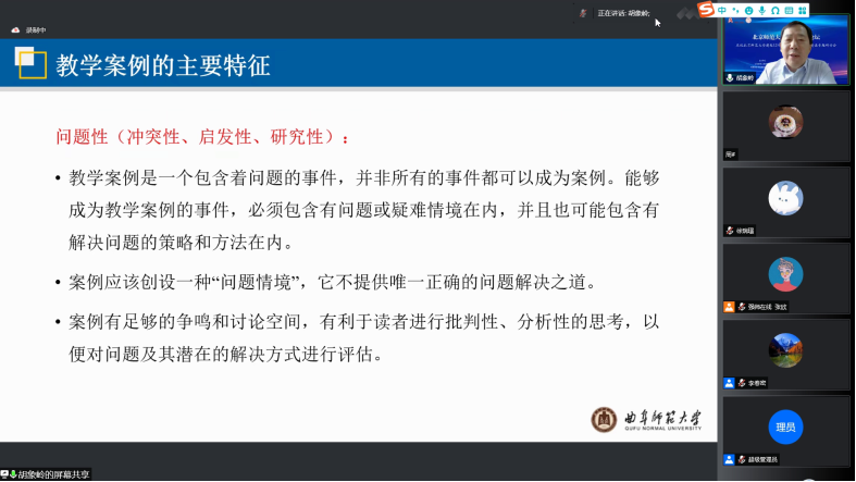 曲阜师范大学胡象岭教授以《教学案例的主要特征》为题,从政策背景和案例教学需求的角度,介绍了为什么要开发教学案例,将案例教学所需要的案例具有的主要特征总结为:功能性、真实性、叙事性、问题性,列举了案例编写存在的突出问题及建议。