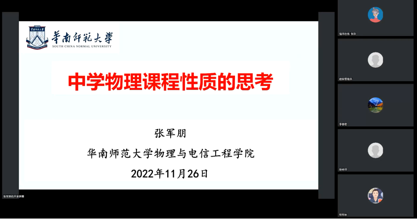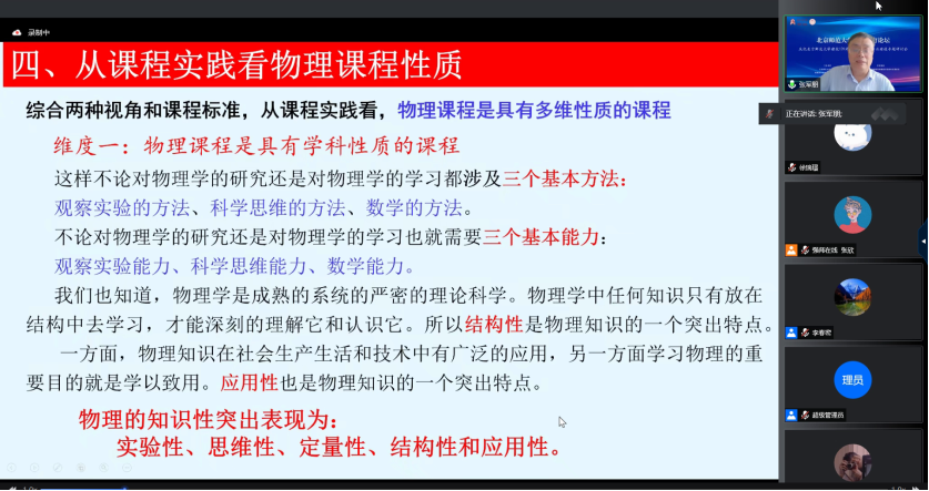 华南师范大学张军朋教授以《中学物理课程性质的思考》为题,介绍了课程性质指的是什么,从学科视角和培养人的视角解读了如何审视物理课程性质,从初高中物理课程标准以及课程实践看物理课程性质。
