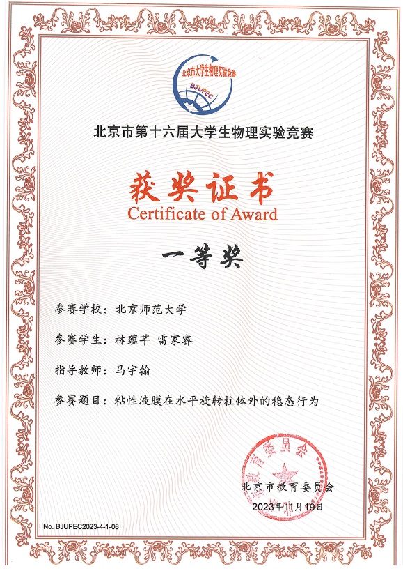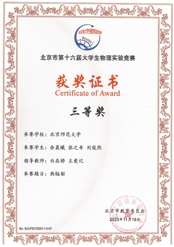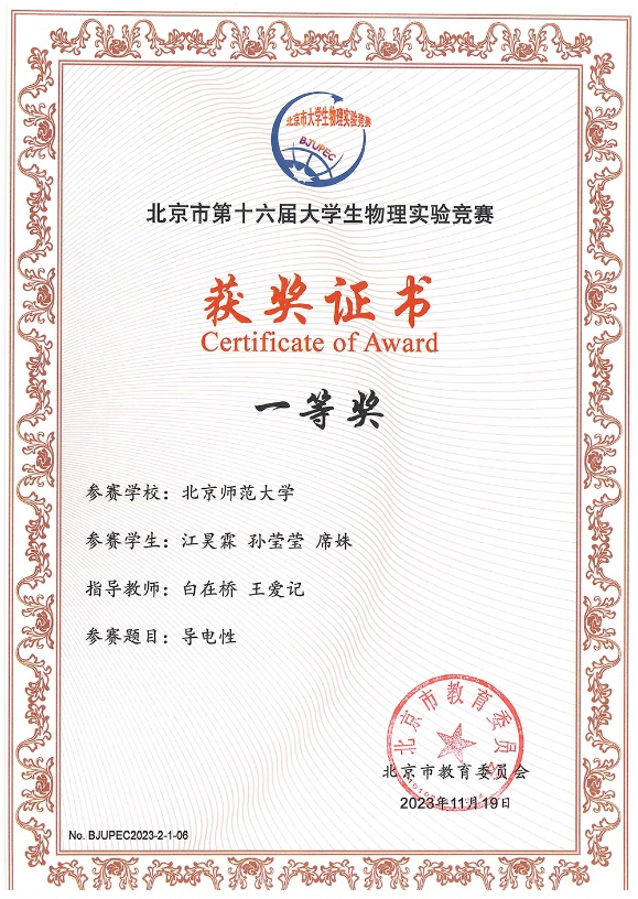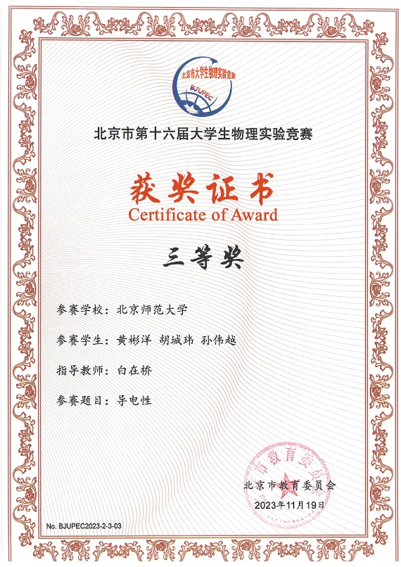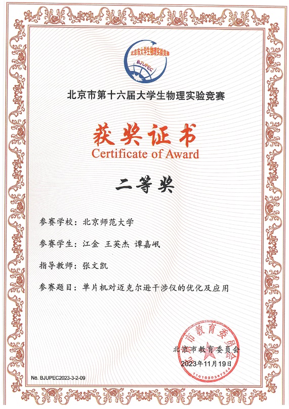 2023年11月19日,由北京市教育委员会主办、北京交通大学承办的第十六届北京市大学生物理实验竞赛在北京成功举办。共有来自35所北京和华北地区高校的150支队伍、500余名同学参加。由a漫画 物理学系选拔组织的7支队伍共17名同学参加了本次竞赛并取得佳绩,2支队伍获得一等奖、3支队伍获得二等奖、2支队伍获得三等奖。