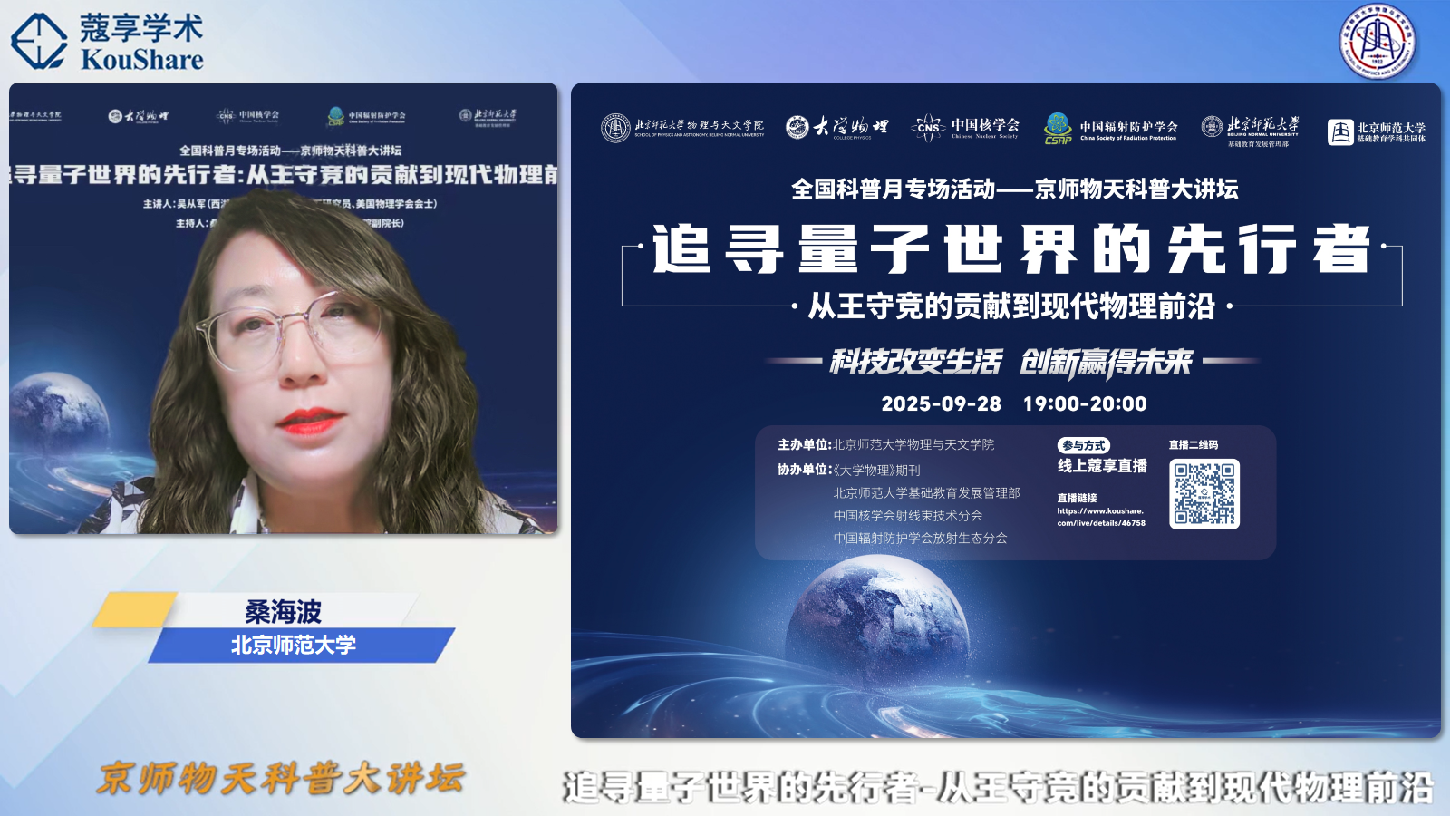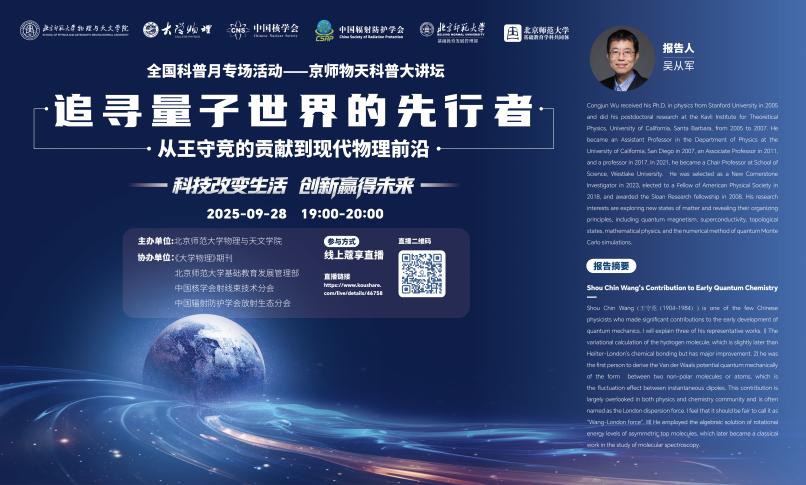 金秋盈硕果,智见启先声。2025年9月28日,在全国科普月“科技改变生活,创新赢得未来”的主题引领下,a漫画 成功举办了京师物天科普大讲坛线上专场活动。本次活动特邀西湖大学讲席教授、美国物理学会会士、新基石研究员吴从军教授,带来主题为“追寻量子世界的先行者——从王守竞的贡献到现代物理前沿”的精彩讲座。来自全国多所中学、a漫画 附属基础教育学校、高校及科研院所的近万名师生与科技爱好者相聚云端,共同聆听这场跨越百年的科学对话。