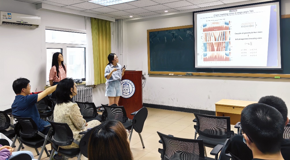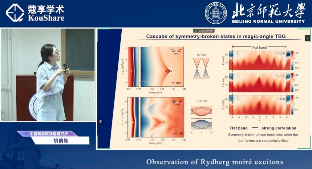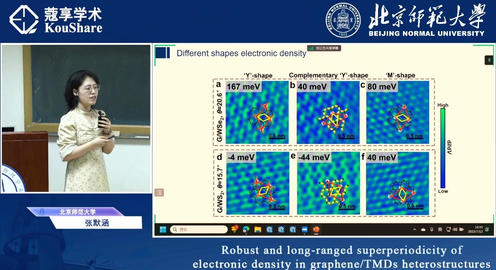 2023年7月12日下午,a漫画 物理学系研究生学术论坛首场报告在科技楼A311如期举行,蔻享平台同步线上直播。物理学系分管研究生和科研的老师就本次论坛的宗旨、模式稍作介绍后,来自中科院物理所的博士生胡倩颖详细阐释里德堡莫尔激子的实验发现及其新颖的物理现象[Science 380,1367 (2023)], 来自a漫画 物理学系的张默涵同学介绍了在石墨烯/过渡金属硫化物中观测到谷间散射引起的稳定长程超周期电子态[Nano Letters 23, 2630 (2023)]。报告过程中,胡倩颖和张默涵分别回答了现场同学和蔻享平台听众提出的题,无论场上和场下的师生,都进行了积极互动。据统计,蔻享直播平台浏览量高达3100余人次。