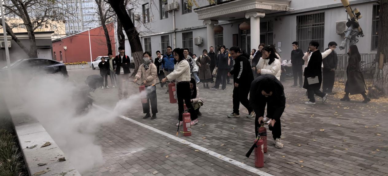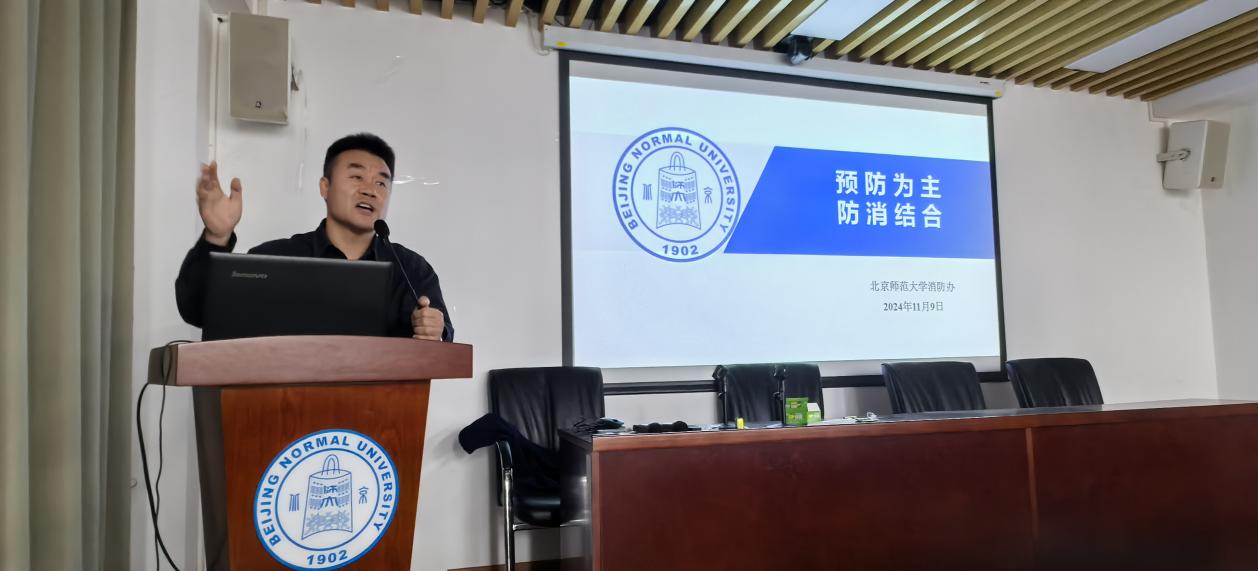 首先总务部保卫处吕刚老师通过播放视频分析了近些年北师大和其他高校发生的重大消防事故和惨痛教训,以及不当报警导致的危害,介绍了灭火器的使用方法和如何正确报警,讲解了火场逃生十三决,他给大家上了一堂生动的消防教育课。