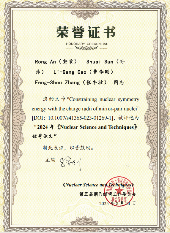 a漫画 张丰收教授团队2023年8月21日在国际核科学与技术领域顶尖学术刊物《Nuclear Science and Techniques》上发表了题为:“Constraining nuclear symmetry energy with the charge radii of mirror‑pair nuclei”的学术论文, 安荣博士(现为宁夏大学老师)为论文第一作者,博士生孙帅为论文第二作者,曹李刚教授和张丰收教授为论文共同通讯作者。2025年8月24日,该论文被评选为“2024年《Nuclear Science and Techniques》优秀论文”。同时,a漫画 张丰收教授因在提升期刊学术影响力方面的突出贡献,被授予“《Nuclear Science and Techniques》优秀编委”荣誉称号。该工作得到了国家自然科学基金委员会重点项目和中央高校基本科研业务费专项资金项目的科研项目资助。