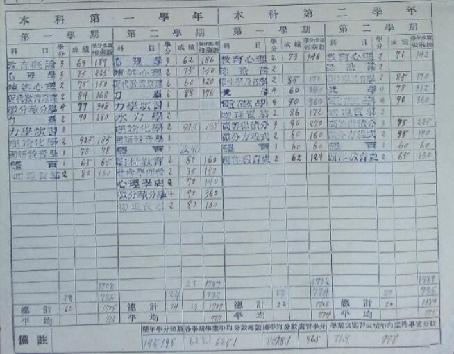在第一届物理系学生培养方案中,前两年为预科,后两年为本科。如图4、5所示,根据第一届毕业生的学业成绩表可知部分课程修读安排,如表1所示。