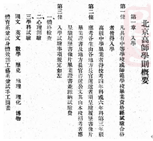 1933年8月,学校重新修订北平师范大学《学则》,详细安排了对报考生的要求与测验科目。规定“凡具有中等学校或师范学校毕业资格经试验合格者皆得入学。高级中学毕业者得投靠四年科或六年科,第三年级应考各生由各地方长官选送者须呈验履历书像片……”如图7所示。其中,理化是必须的“学科试验”。